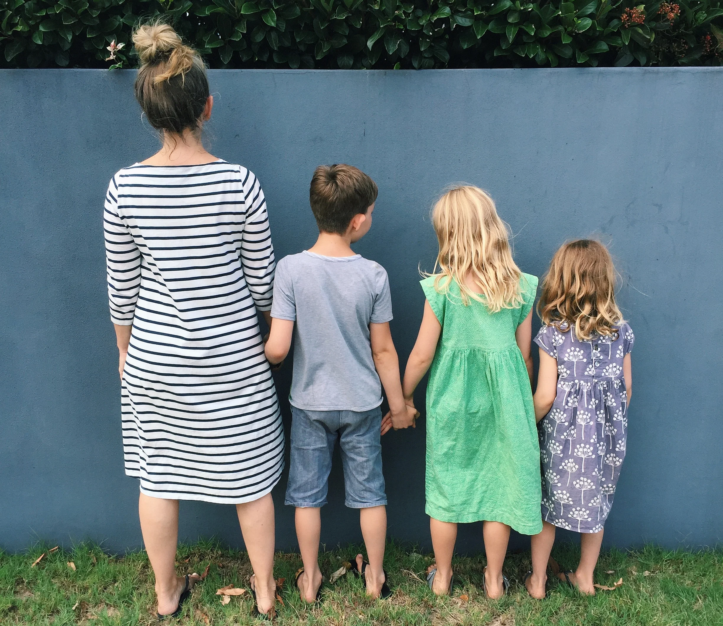 I jump out of the car, ready to rumble and herd my clan, but then I have a tiny moment. I look at my brood and I realise that four out of the five members of my little posse are wearing hand made. Totally handmade. Not a top with a store bought skirt…. But totally handmade. Which leads to another realisation - it’s been a while between drinks. So much so that I got the fella to take the photo you see above to mark the occasion.